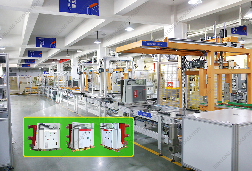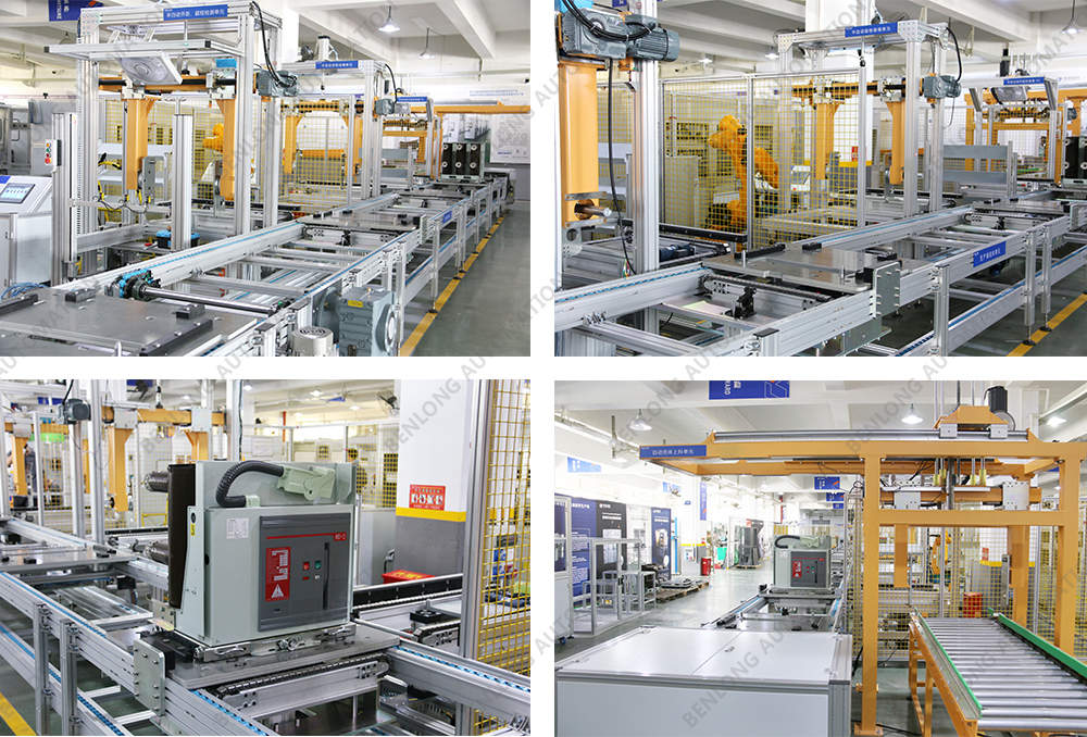 具有自动AGV物流输送、龙门架自动上料、倍速链物流、绝缘筒装配、灭弧室装配、初调装配、初调翻转、机器人锁螺丝、开距、超程、总程、磨合检测、机械特性检测、