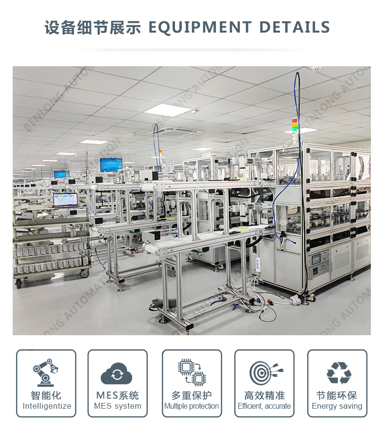 能检测、蓝牙通讯检测、复校检测、装配铭牌、扫码资产信息数据对比、合格不合格区分、包装、码垛、AGV物流、