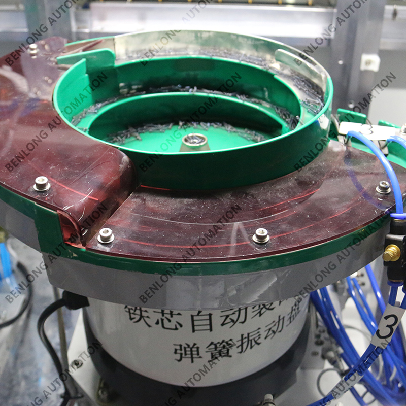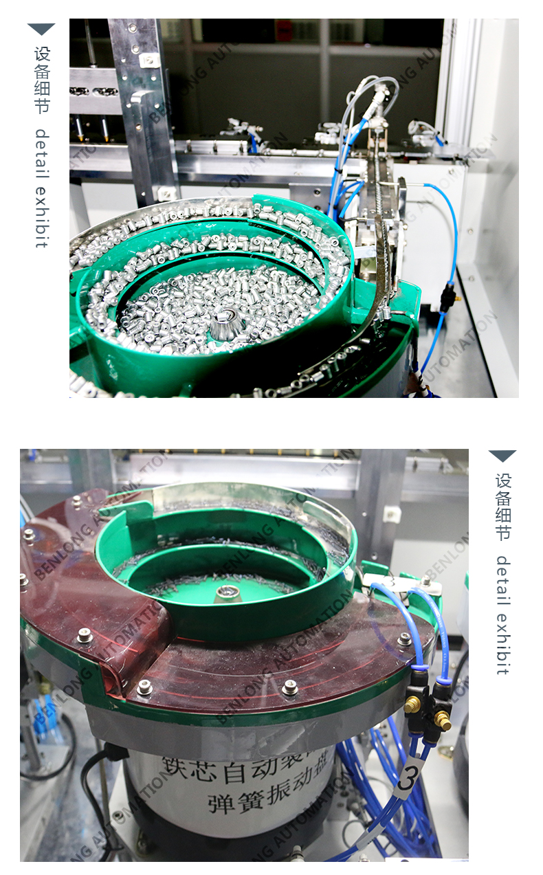 具有自动静铁芯、弹簧、动铁芯、绝缘壳、顶针上料组装、合格不合格区分、下料、包装工序的装配、在线检测、