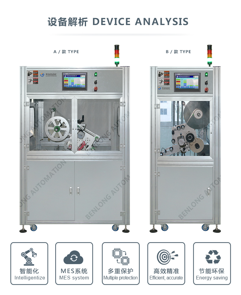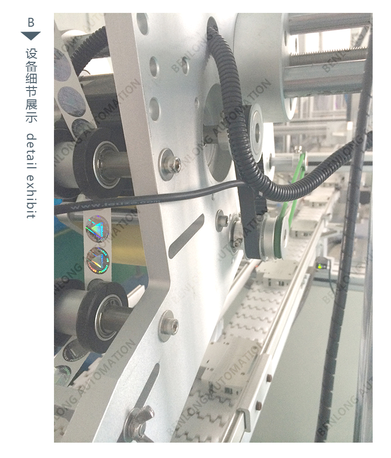 具有自动贴标(二维码标签、条形码标签、ID码标签、图案等)、CCD检测、不良品区分、缺料报警、竖立翻转水平、水平翻转竖立等工序的在线监测、