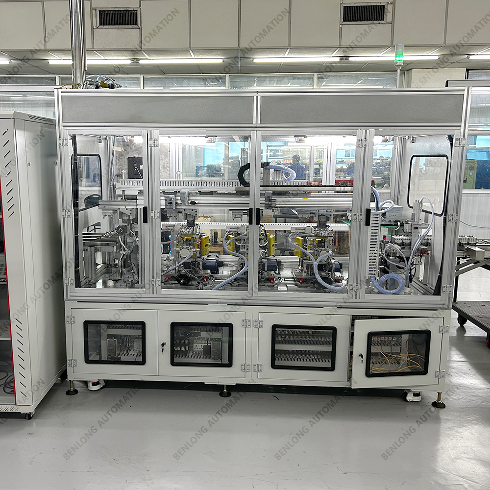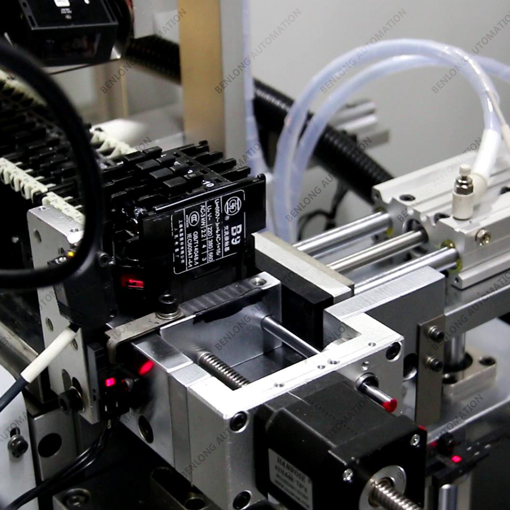 具有自动上料、插芯装配、底座装配、主辅静触头装配、人工装配宝塔弹簧、锁上下盖螺丝、锁瓦片螺丝、通断、耐压、功耗、前倾吸合、