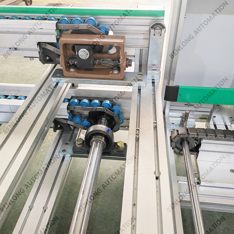 5、待检区说明:转弯处改用顶升旋转滚筒线,产品从**条装配线进入至滚筒线,然后气缸顶起,旋转90°后下沉,由滚筒输送至第二条待检线,要